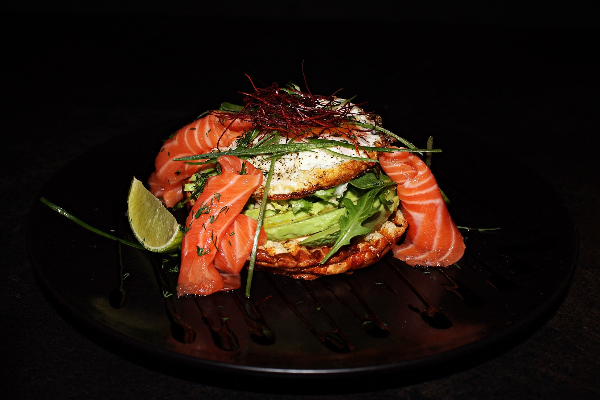 (brioche, salmon, avocado, hollandaise sauce, salad mix, fried egg)