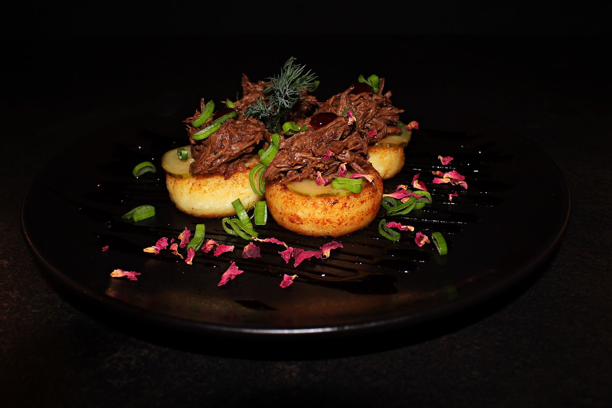 Сырники с тертой говядиной на томатной основе, солеными огурцами и зеленью