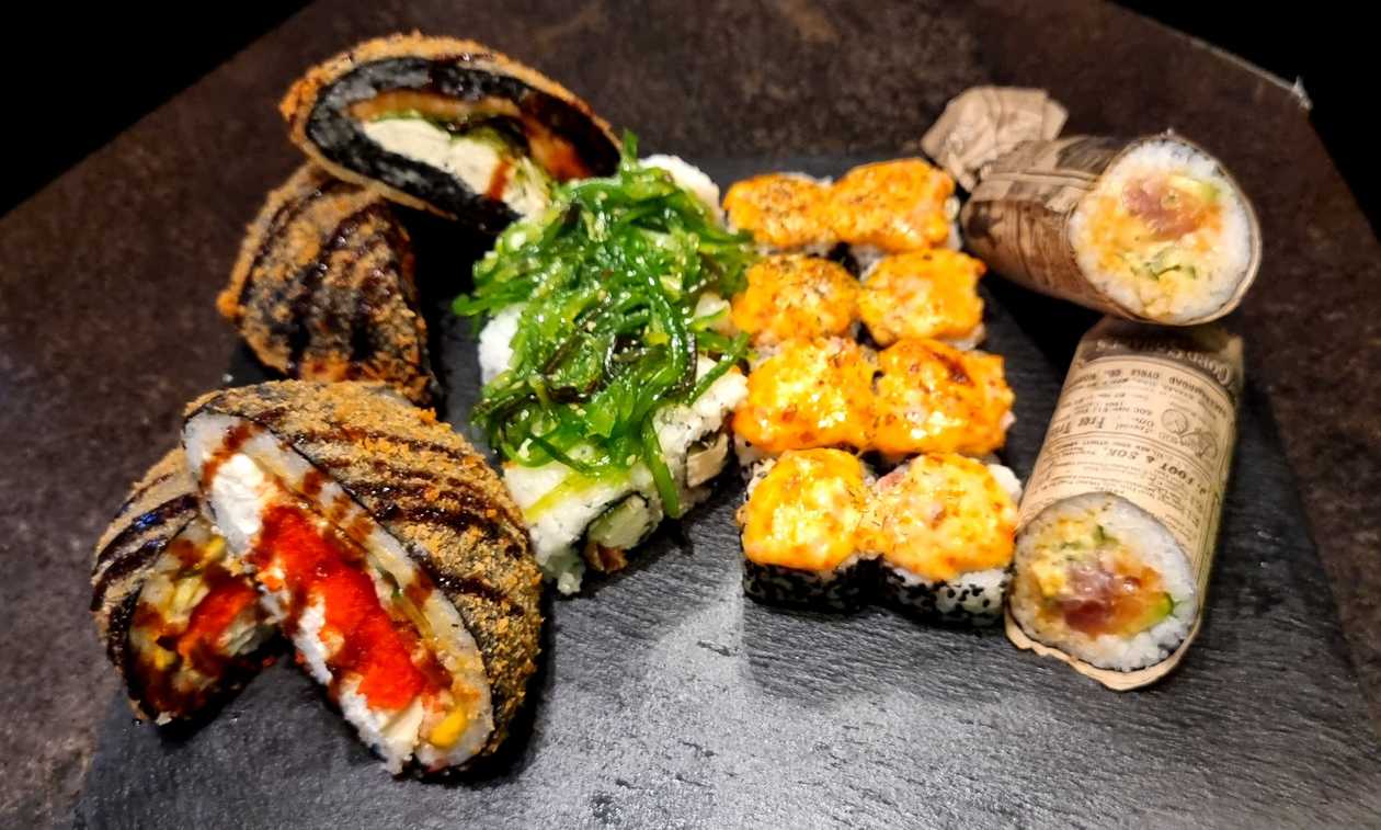 Бургер с лососем Black Star, бургер с унаги, маки вакаме, запеченный бекон с кунжутом, суши-буррито с тунцом