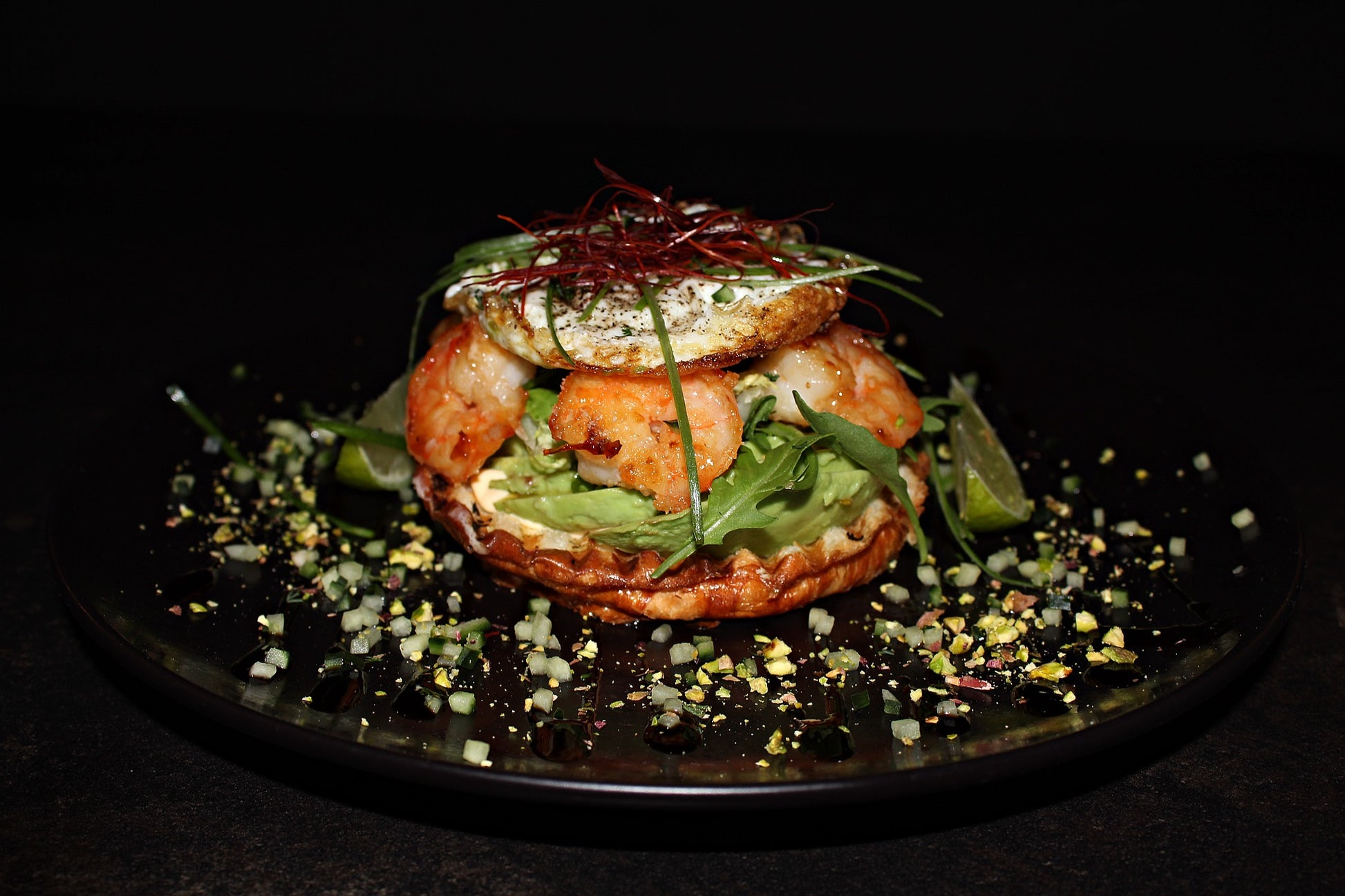 (креветки, салатный микс, фисташки, голландский соус, сладкий соус чили, жареное яйцо)