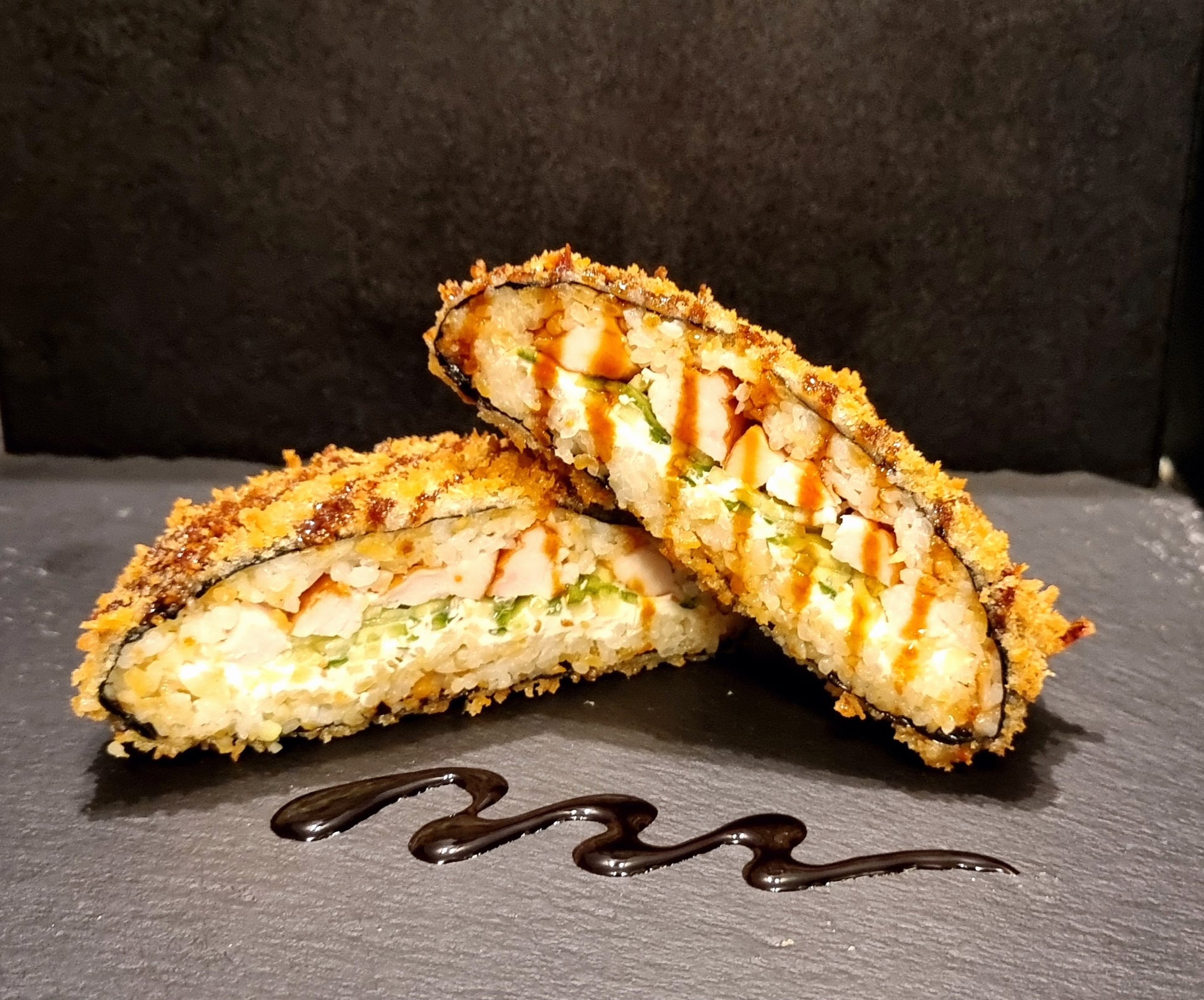 Сливочный сыр, кунжут, салат, огурец, сушеный куриный гирос, панировка, соус Унаги