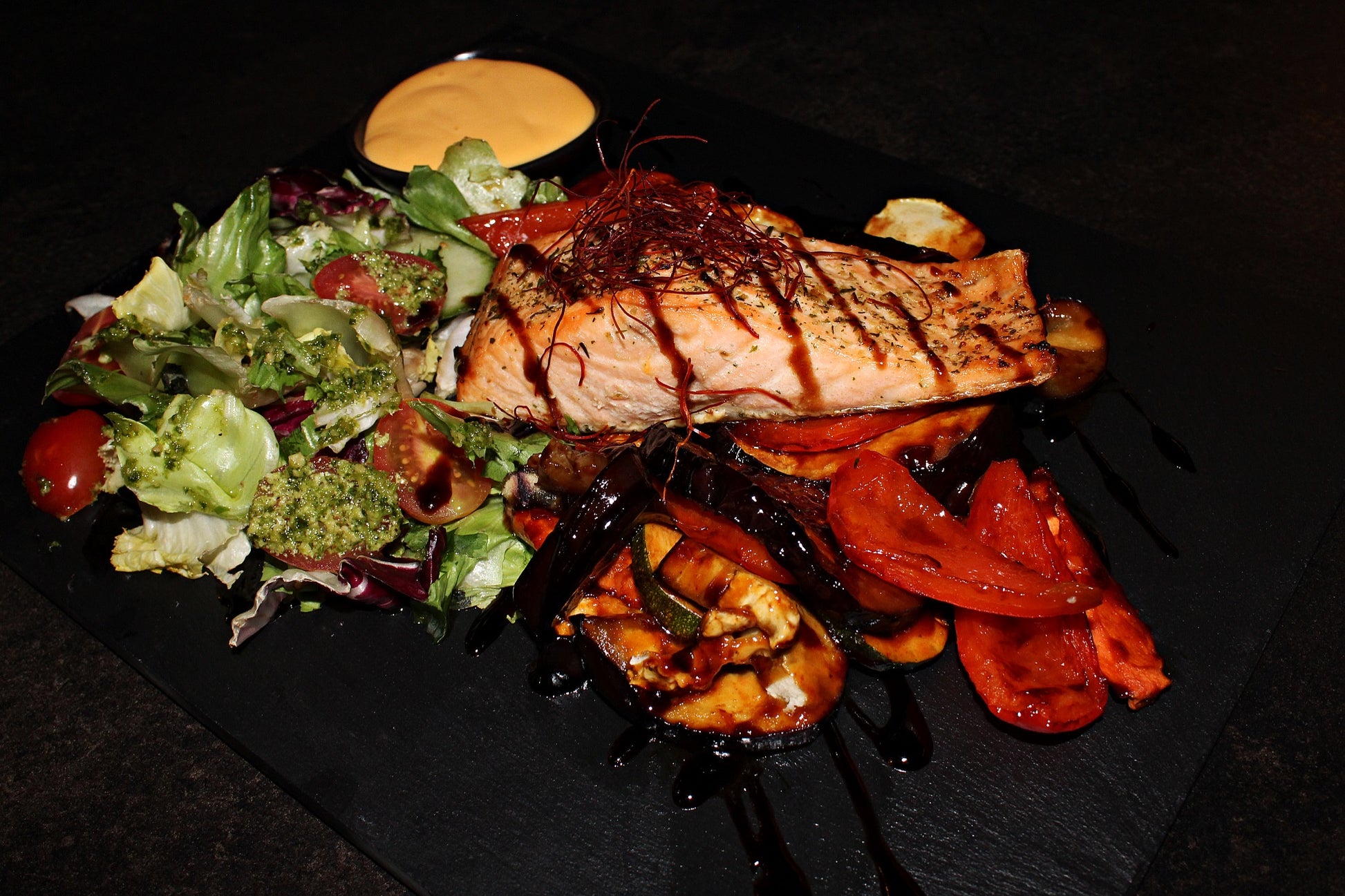 Стейк из лосося с красным песто, овощами на гриле, салатом из трав и голландским соусом