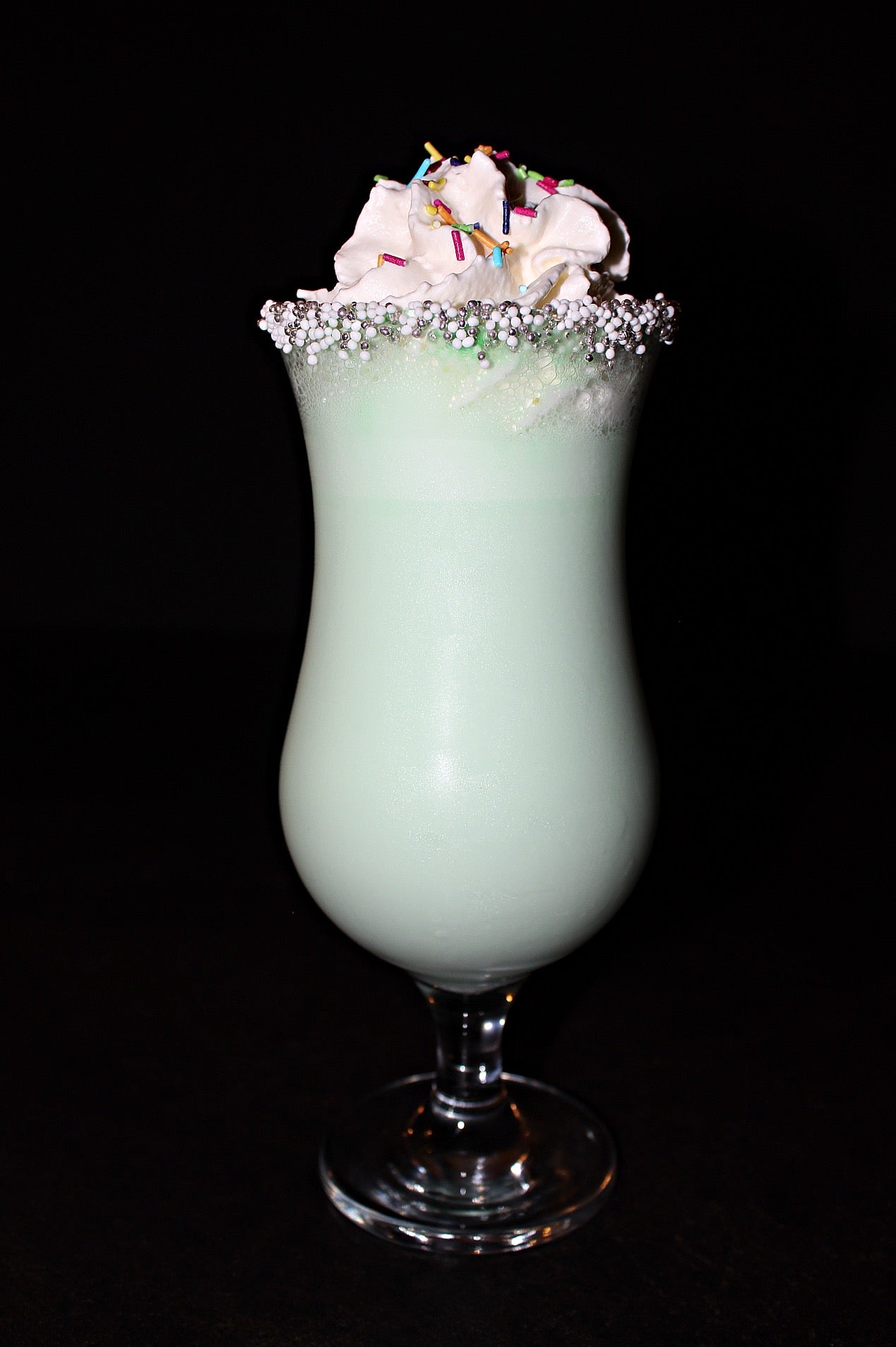 Персиковое пюре, мороженое пломбир, молоко, мятный сироп Монин, взбитые сливки