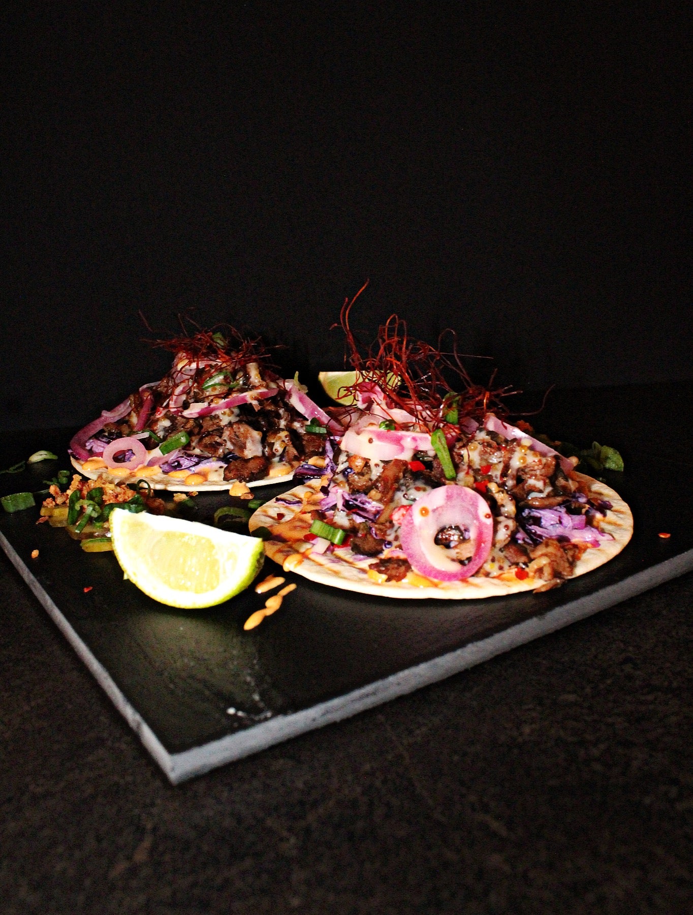(тушеная говядина, тортилья, маринованный лук, соус барбекю, салат из капусты, медово-горчичный соус, хрустящий лук, маринованные огурцы, зеленый лук)