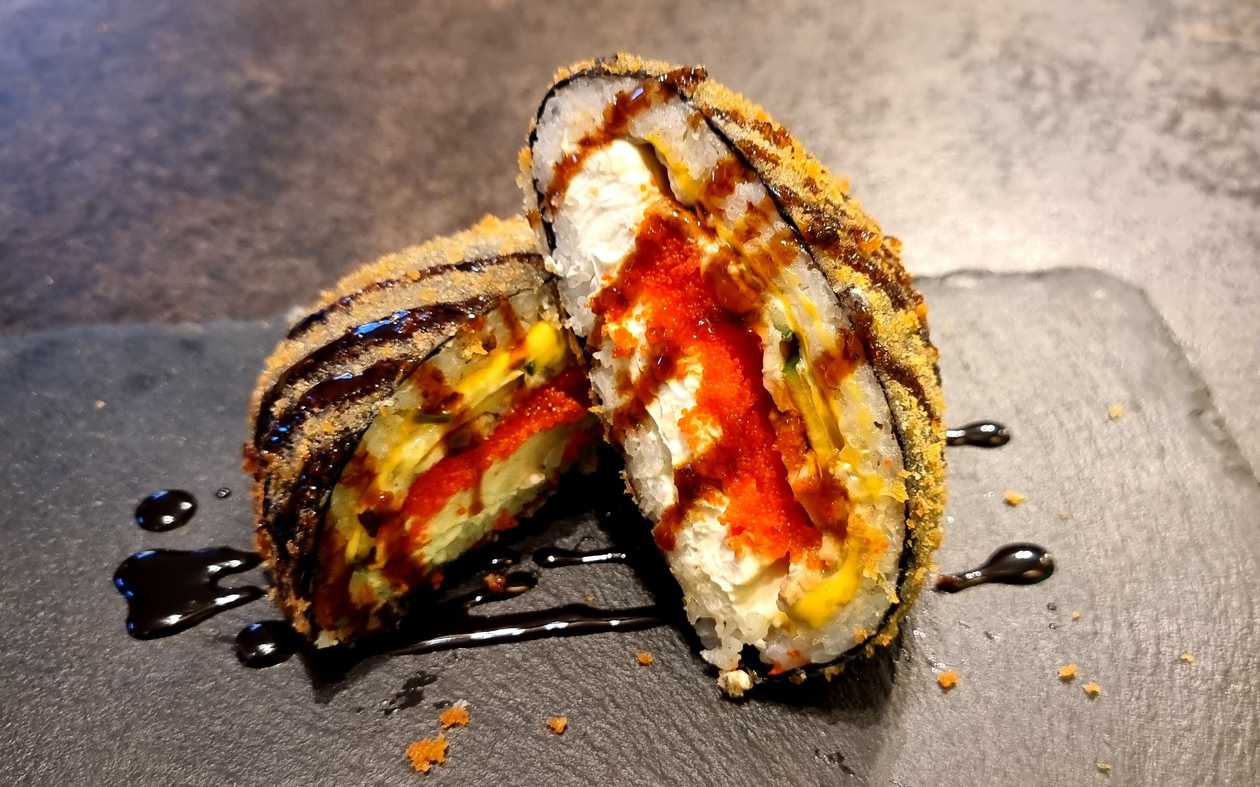 Угорь, красная икра Массаго, сливочный сыр, огурец, сыр Чеддер, темпура